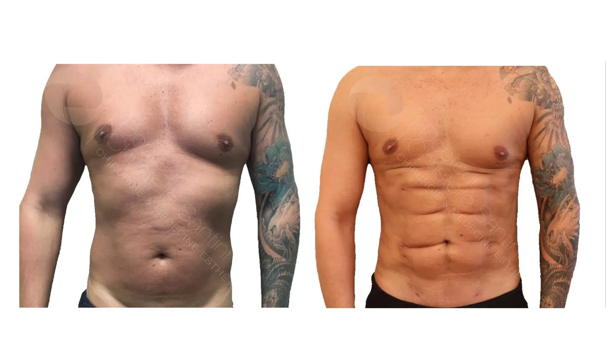 Photo de profil face du torse et ventre d un homme avant/apres liposuccion vaser | Dr Santini Paris 16