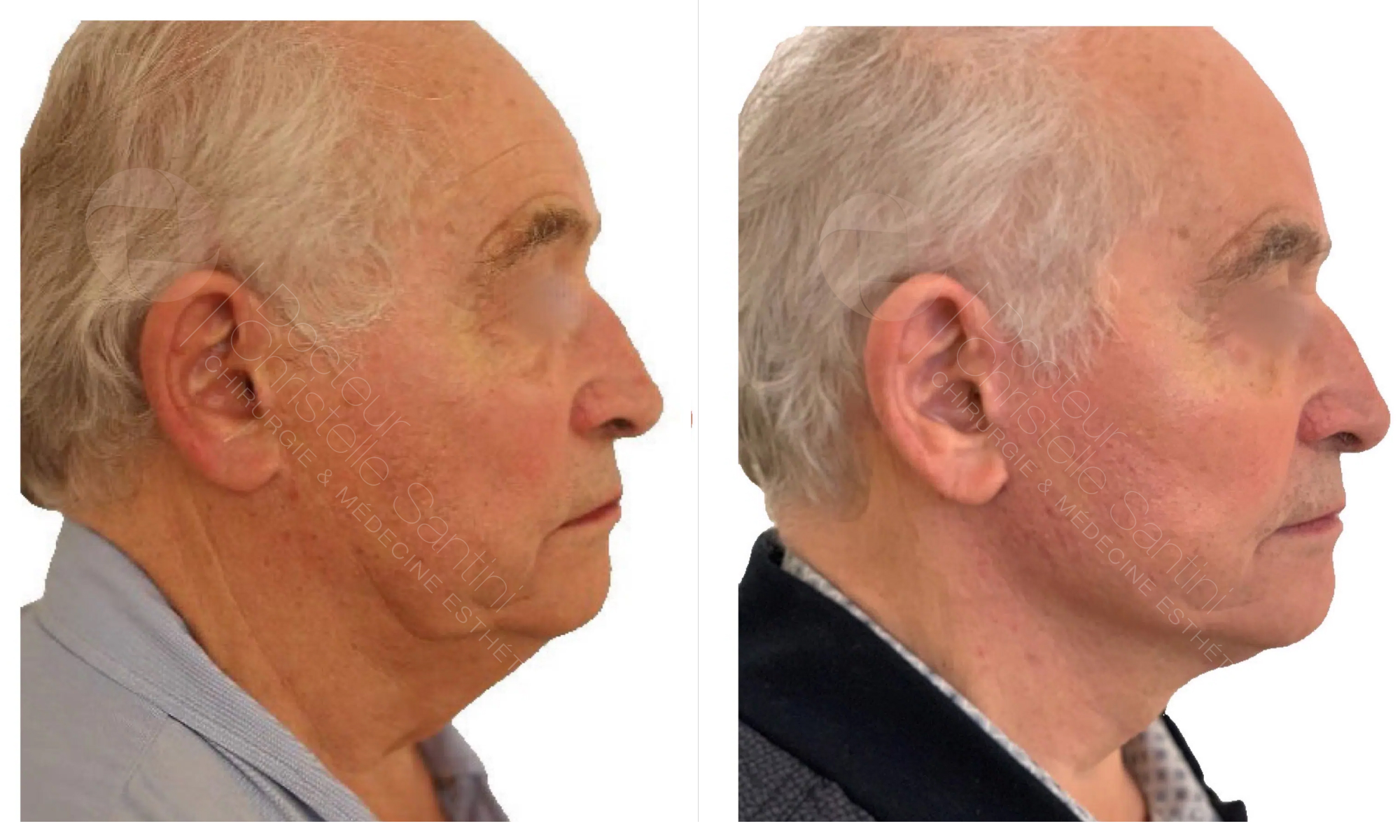 Lifting cervico-facial associé à une chirurgie esthétique des 4 paupières et à une liposuccion du cou chez un patient de 82 ans réalisés par le Docteur Christelle Santini, Chirurgien esthétique à Paris
