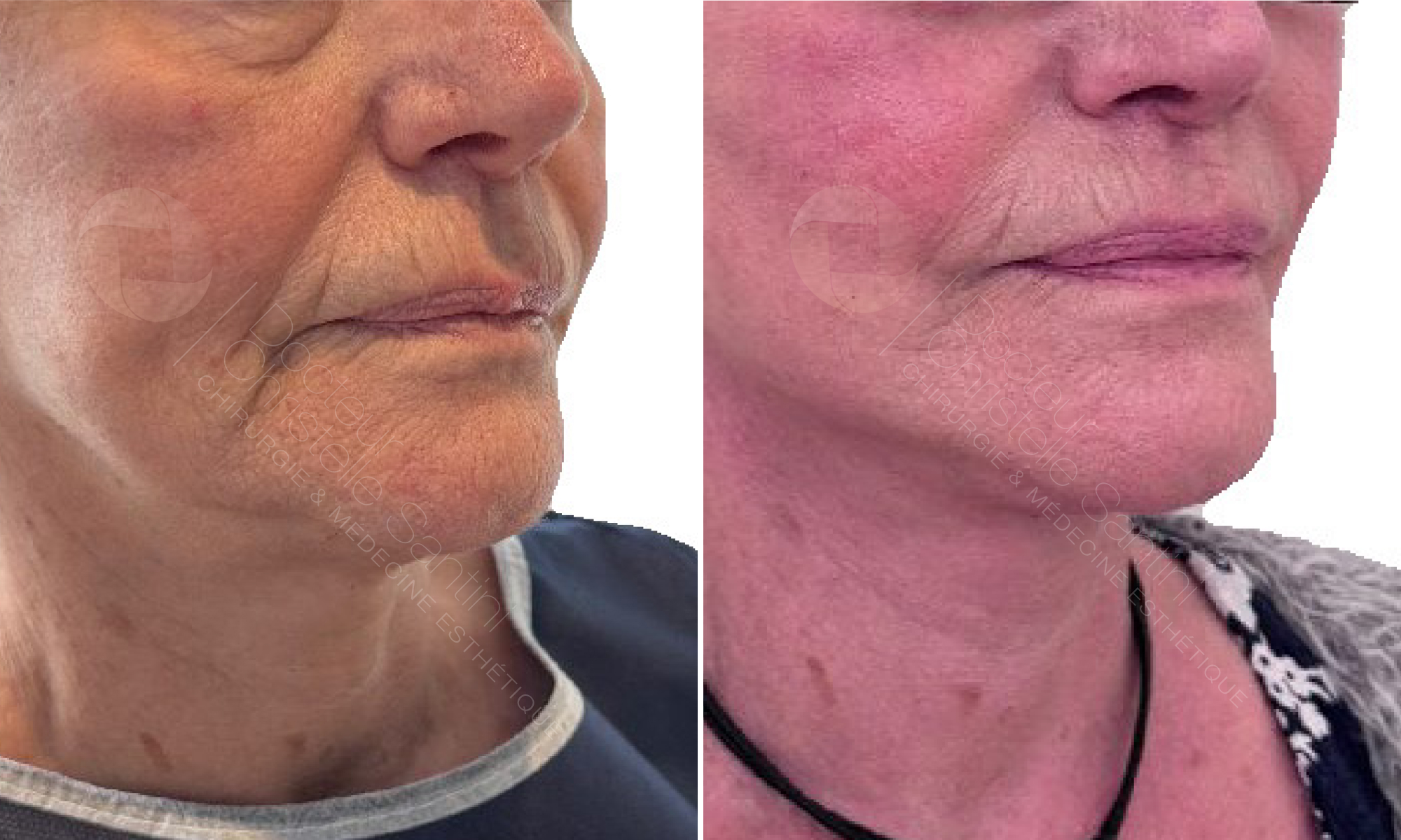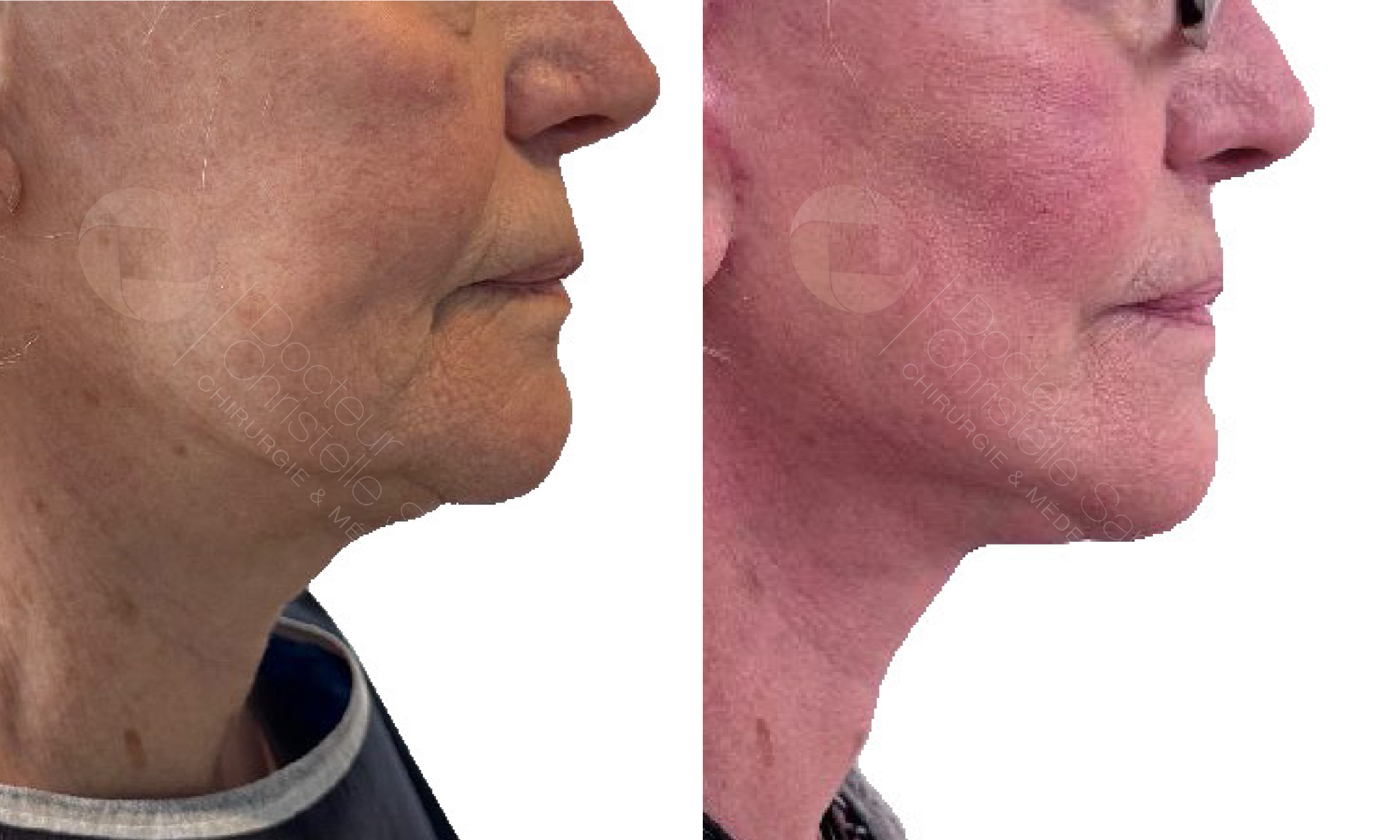 Lifting du visage (lifting du bas du visage et du cou) associé à une liposuccion du cou chez une patiente de 47 ans effectué par le Docteur Christelle Santini chirurgien esthétique à paris